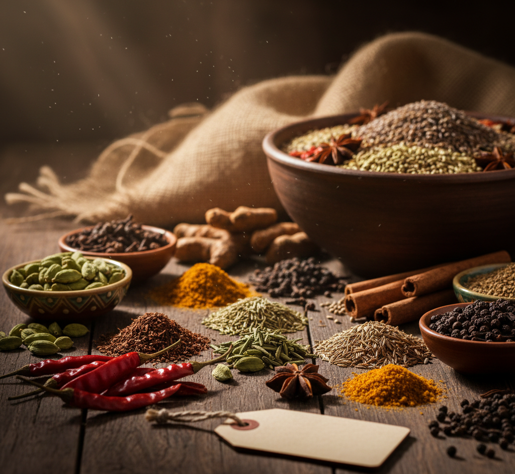 Cloves, black pepper, nutmeg, and long pepper from certified farms.